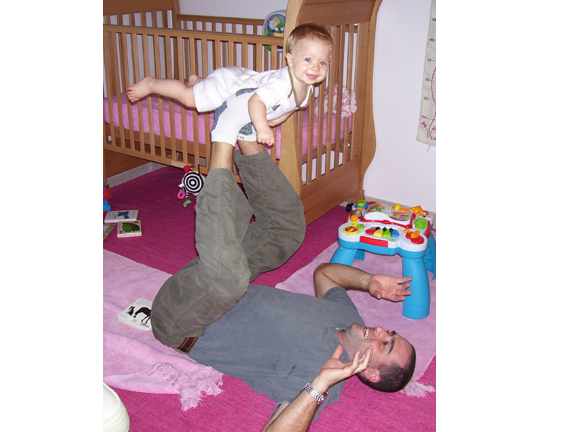 Dads can sing to their babies or tell them nursery rhymes, stories, or even the events of the day. Dads can do skin-to-skin kangaroo care. Dad can hold baby against his chest, letting baby hear his deeper voice and feel his breathing and heart beat. It’s very soothing. Dad can read books to the older baby. Dad can carry the baby in a sling or front packon a walk in the house or outside. When the baby is ready for solid foods, at around 6 months, Dad can be involved in the feeding, too. As the photo shows, dads play differently with babies than moms do, and babies love theis! (Just no tossing or shaking, please).